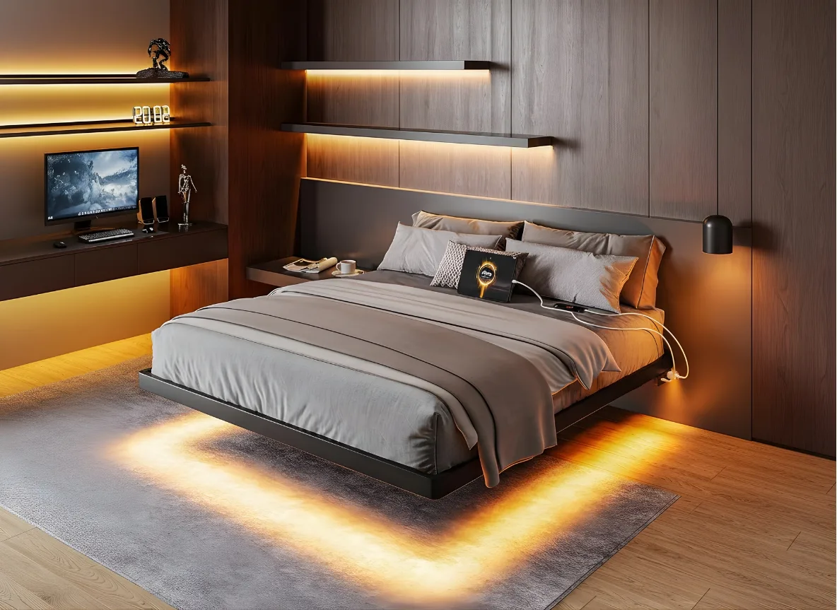 Floating beds are known for their sleek and futuristic appeal. Designed with hidden supports, they create the illusion of floating above the floor. This design makes the bedroom feel more spacious and modern. Soft lighting underneath the bed enhances the overall visual impact.