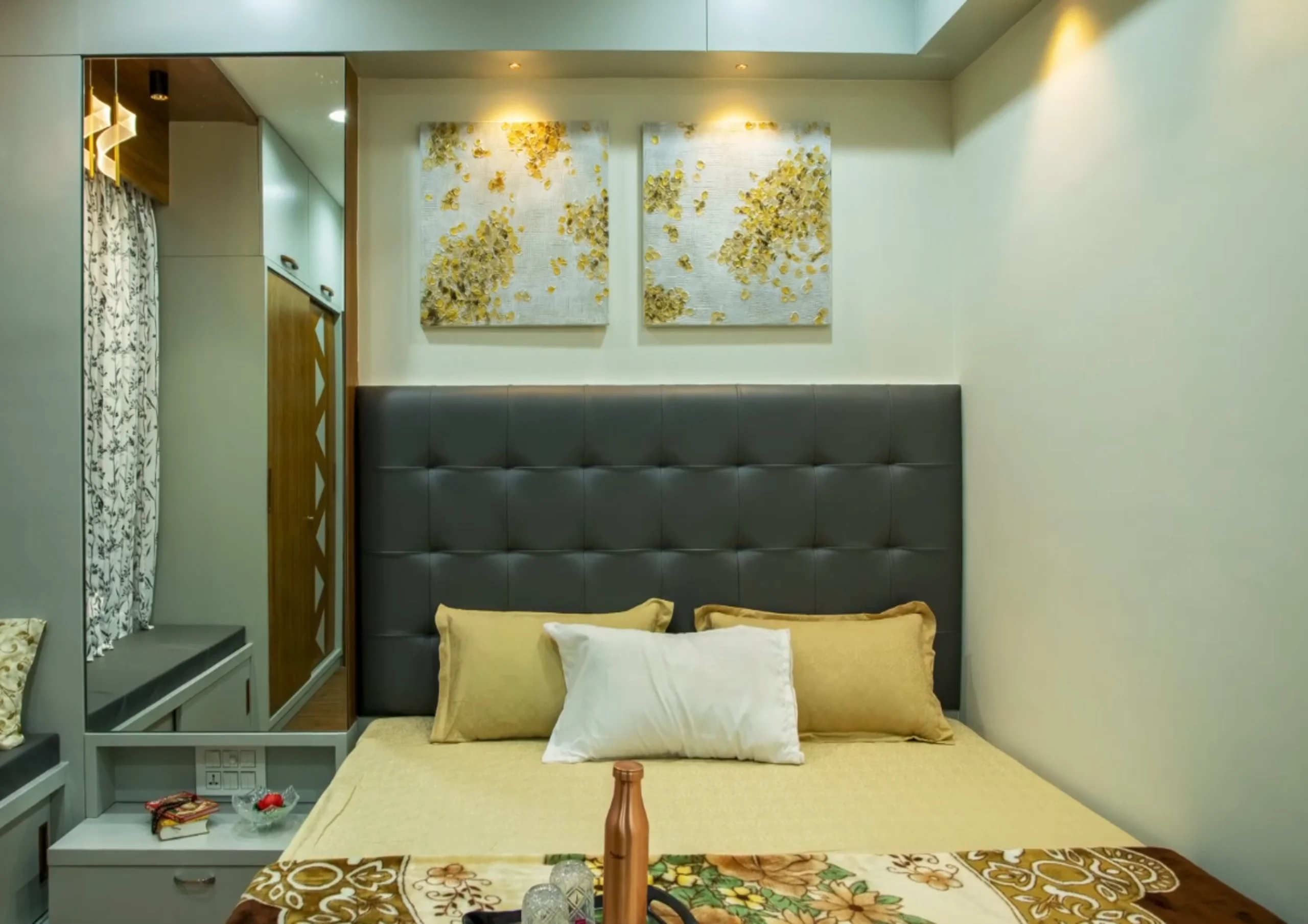 The master bedroom serves as a private retreat. Soft wall colors and warm wooden elements create a peaceful environment. The upholstered headboard adds comfort and subtle luxury without overpowering the space.