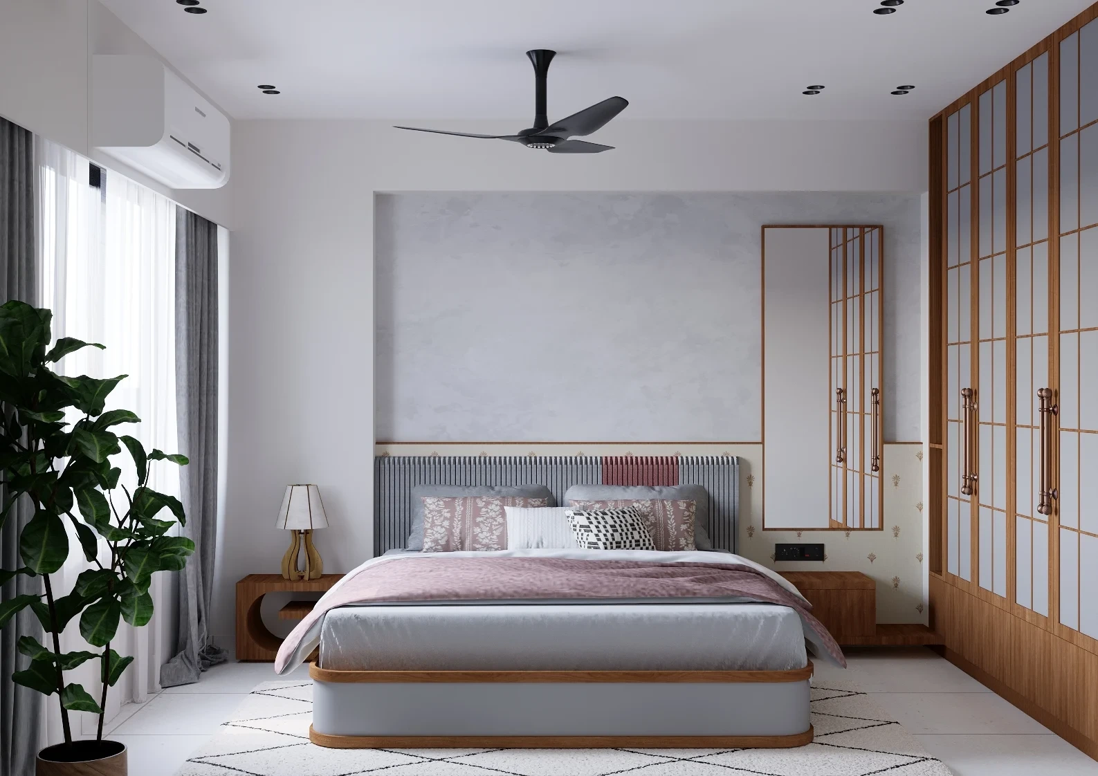The master bedroom reflects comfort and luxury. We used soft grey and blush pink tones to create a relaxing atmosphere. The custom headboard features textured panel detailing for a premium look. Matching wooden bedside tables add balance. The wardrobe includes glass panel detailing and elegant handles.