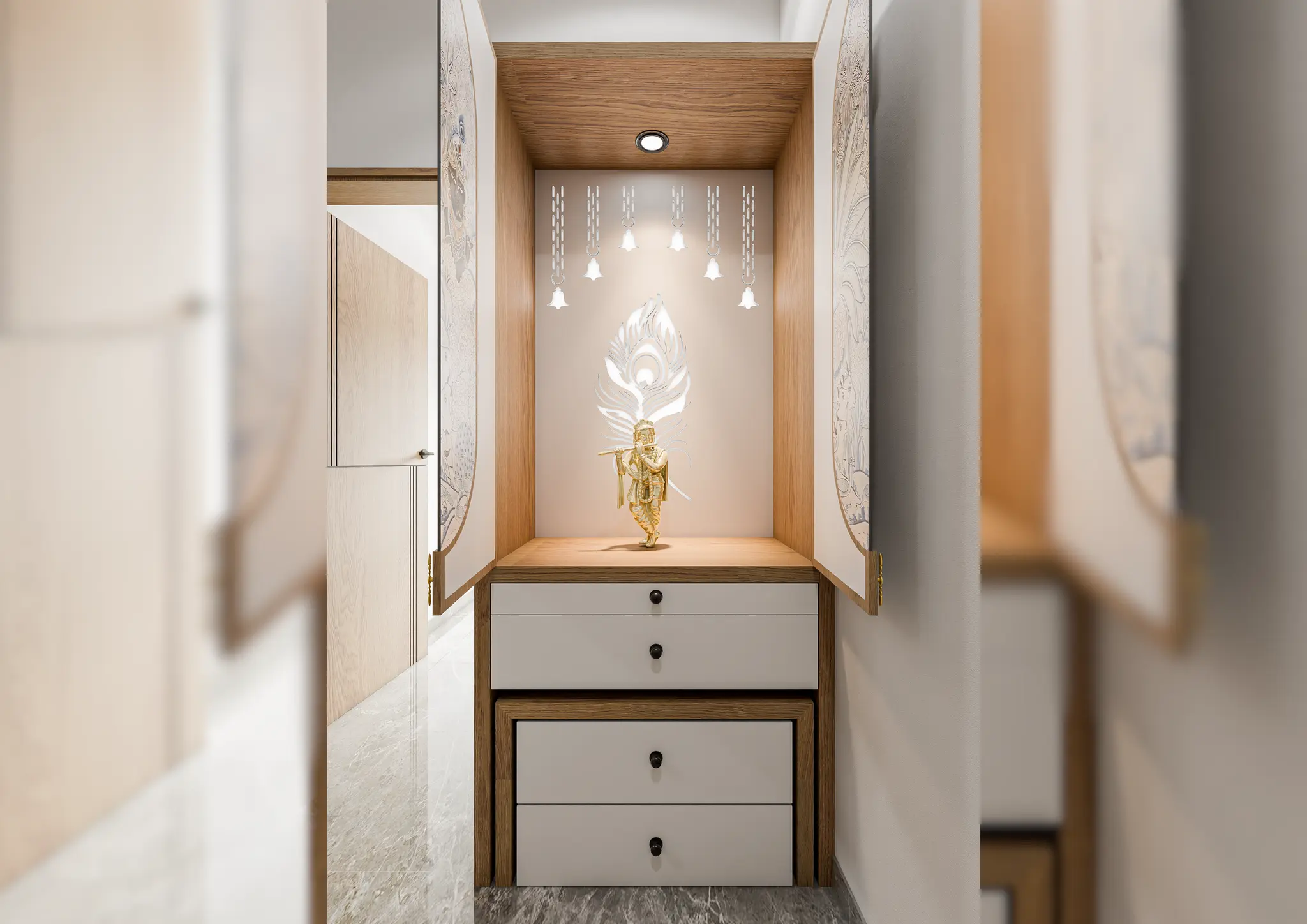 The mandir space is designed with simplicity and respect for tradition. Clean lines, subtle detailing, and warm materials create a peaceful prayer area that blends seamlessly with the home’s modern interiors.