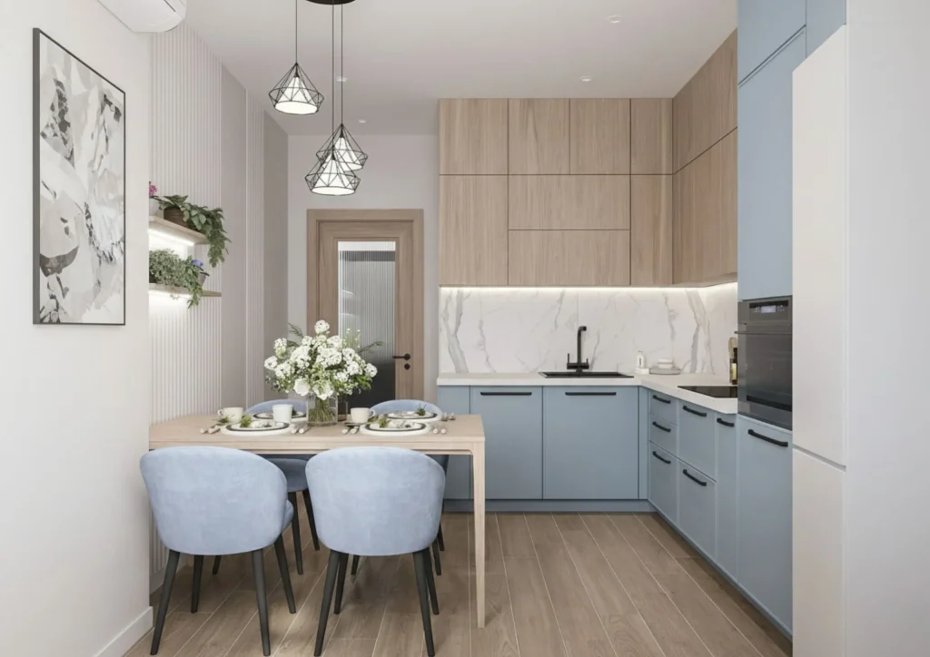 Soft pastel blue paired with light grey creates a calm and modern kitchen atmosphere. This combination is perfect for smaller kitchens, as it feels light and spacious while still adding subtle colour.
