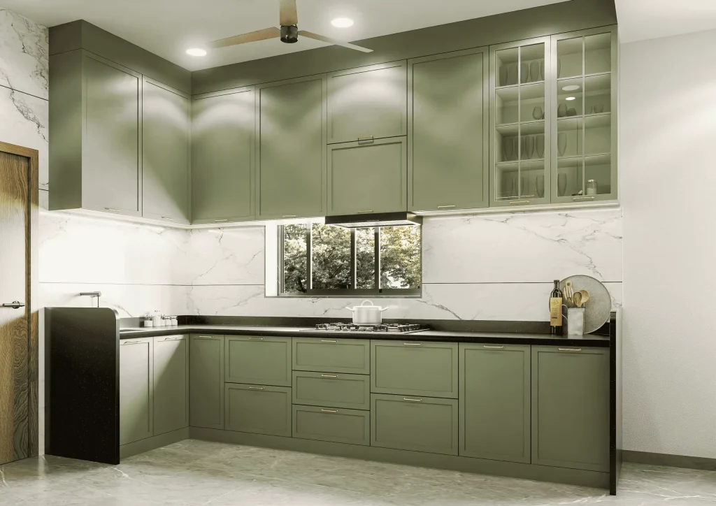 Olive green is emerging as a standout colour in 2026 kitchens. When combined with brass accents, it creates a rich, earthy, and slightly luxurious feel. This combination blends well with neutral countertops and warm lighting.